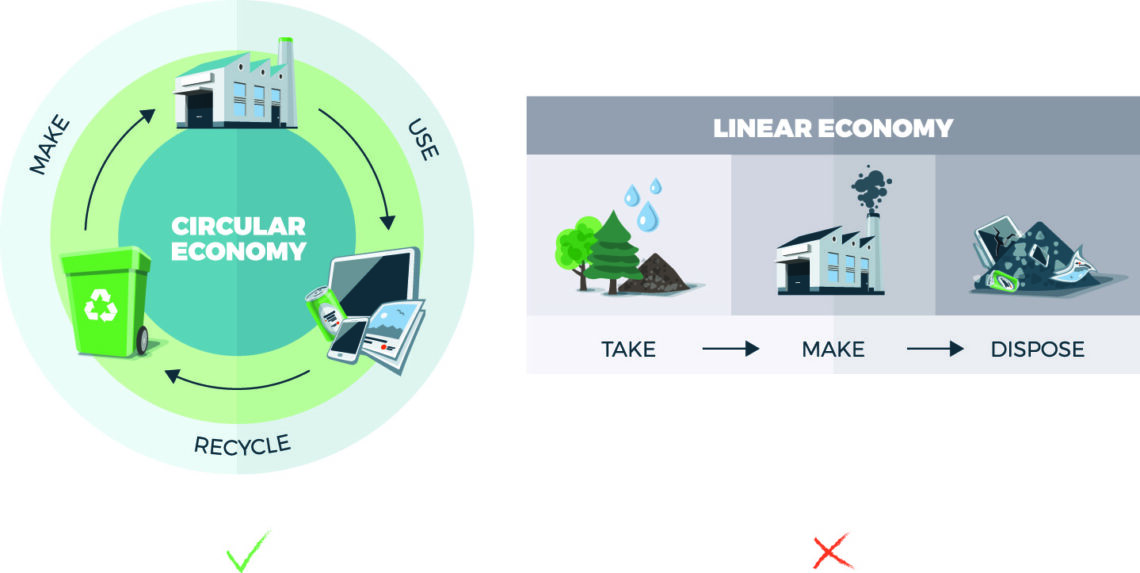 La Economía Circular es una estrategia que se concibe como aquella que transforma el enfoque de las cadenas de producción y de mercado, desde una perspectiva linear (de la cuna a la tumba) a nueva perspectiva circular, donde, por ejemplo, una vez que los productos terminan su vida útil, en lugar de ser desechados o convertidos en basura, se les considera como materia prima de un nuevo producto o servicio (de la cuna a la cuna), con ello se busca imitar a los procesos de la Naturaleza, evitar el agotamiento de recursos y cerrar el ciclo de la materia.