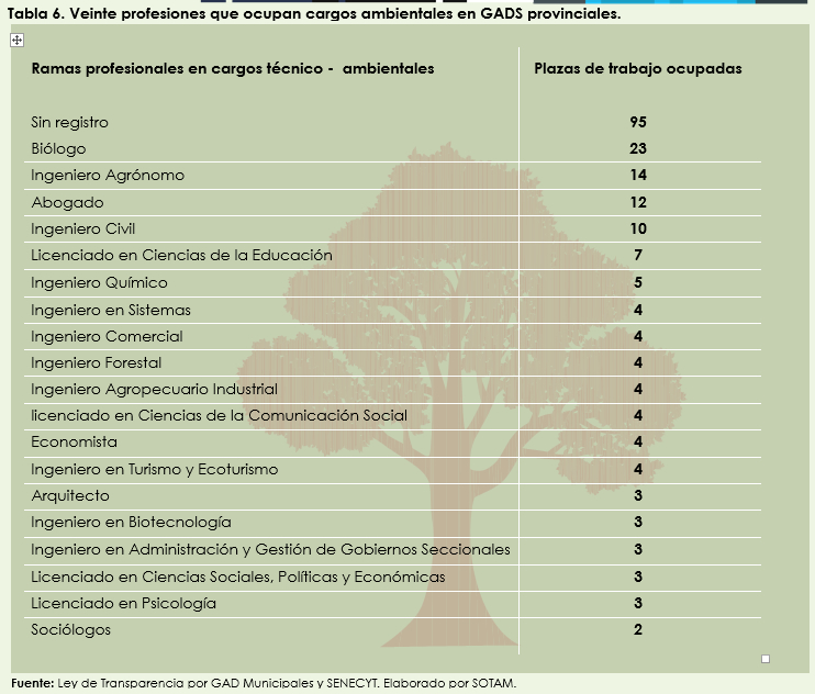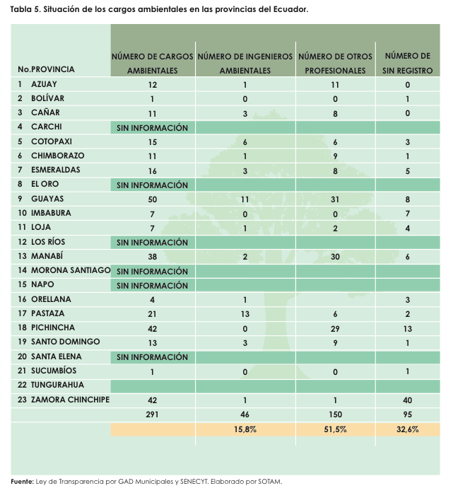 En la tabla 4 se observa la cantidad de cargos técnico–ambientales, en los Gobiernos Provinciales y la realidad de esta ocupación. En la tabla 5 consta información sobre la realidad de esta ocupación por provincias.