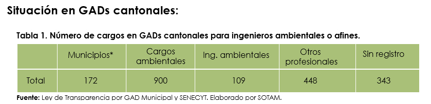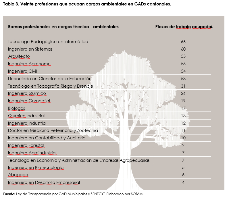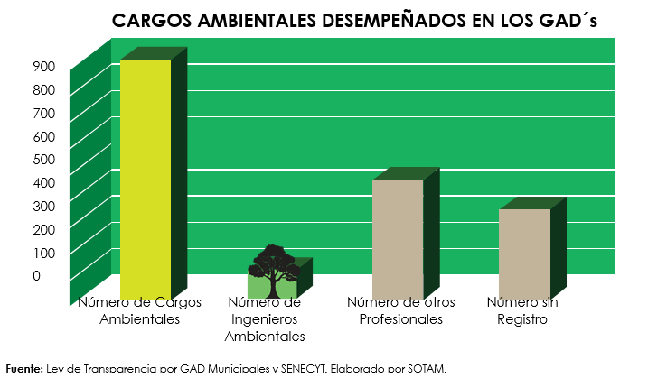 Los datos obtenidos muestran la realidad del país, lo que permite reconocer que el sector público no ha contratado al personal idóneo para ejercer las funciones de la gestión ambiental en GAD Municipales y Provinciales, lo que por ende ha retrasado el avance en los proyectos y calidad ambiental misma; demostrándose en que cada día se sigue degradando el entorno natural en el que nos toca vivir a los ecuatorianos.